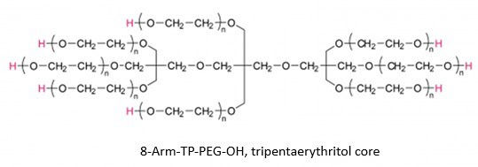 8-Arm-TP-PEG-OH is a multi-armed polyethylene glycol with hydroxyl groups at each terminal of the eight arms. 8-Arm-TP-PEG-OH has the tripentaerythritol core (TP core) that connects to eight identical arms. The indicated molecular weight of multi-arm PEG is the sum of the molecular weights of all arms. The MW of each arm is one eighth (1/8) of the indicated MW.