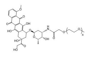 PEG-doxorubicin conjugate is a covalent chemical conjugate in which doxorubicin, an anthracycline antineoplastic agent, is directly linked to polyethylene glycol (PEG) via a stable linker, at the 3′-amino position of the daunosamine sugar. Alternative structure with PEG attached to the 14-hydroxyl group of the aglycone can also be offered. Unlike free doxorubicin, the conjugate exhibits altered pharmacokinetics. The conjugate is distinct from PEGylated liposomal doxorubicin (e.g., Doxil or Caelyx), as it lacks the liposomal carrier and relies solely on polymer-drug covalent bonding for stealth properties and controlled release.