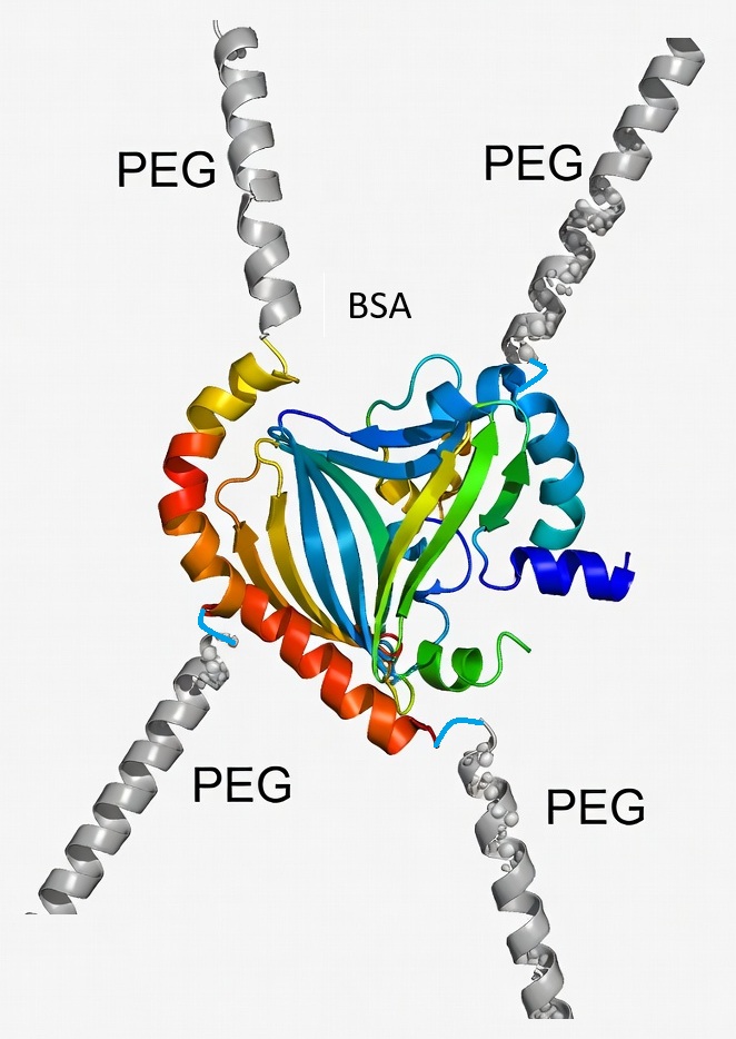 The number of PEG for each protein depends primarily on your application and is limited by the number of reactive amino acids on the protein. We have developed proprietary chemistry protocols to precisely control the number of PEG per protein molecules, ranging from 1 to 80 PEG per each protein. The protein content and the total PEG content (the number of PEG and total PEG mass) are characterized with established analytical methods. We have HPLC, GPC, SDS-PAGE, colorimetric assays for proteins and PEG, enzyme activity assays, protein binding assays and other protein specific assays.